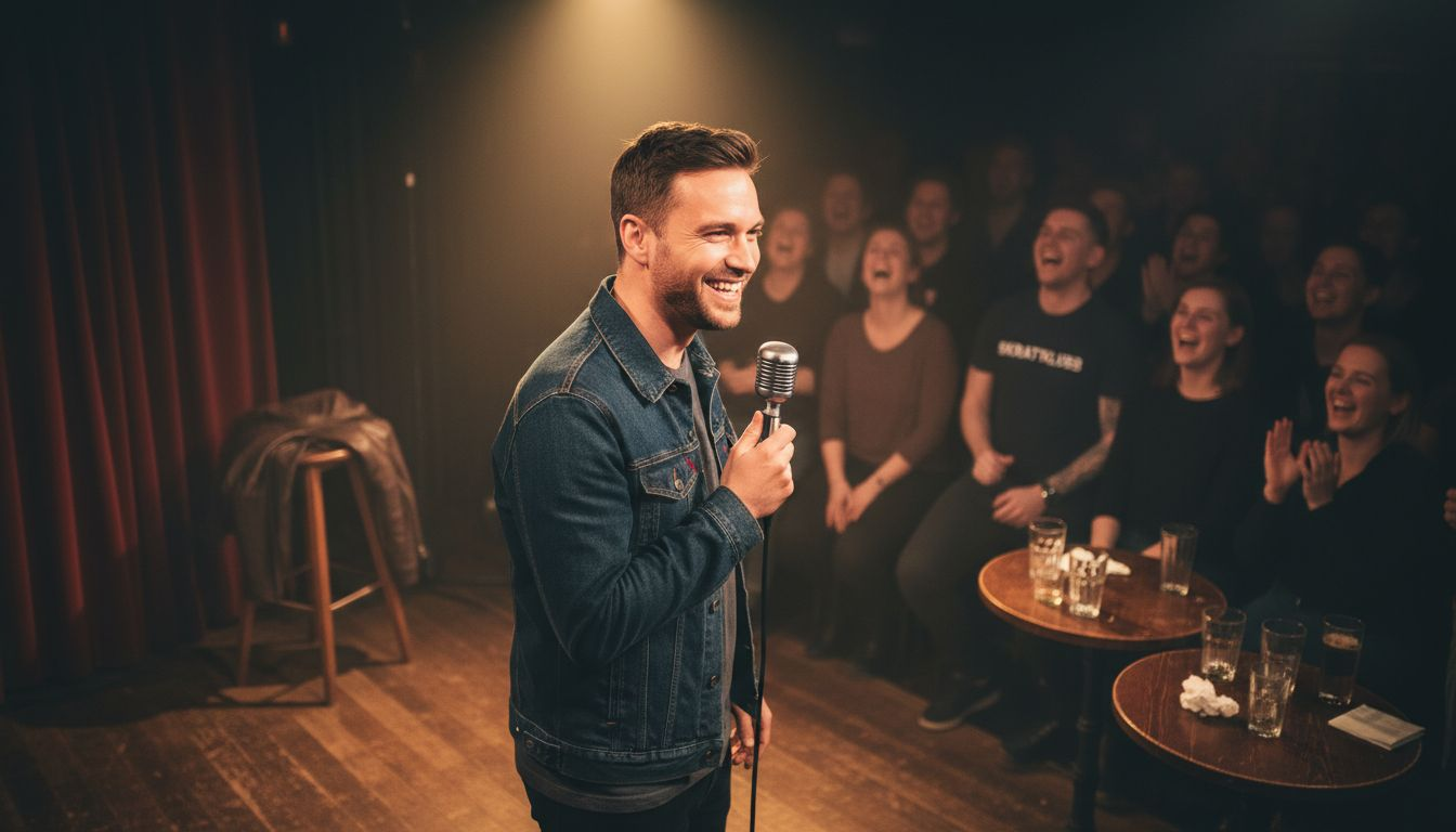 • Carl Stanley ler med mikrofon i handen framför Big Ben Standup-logotypen.